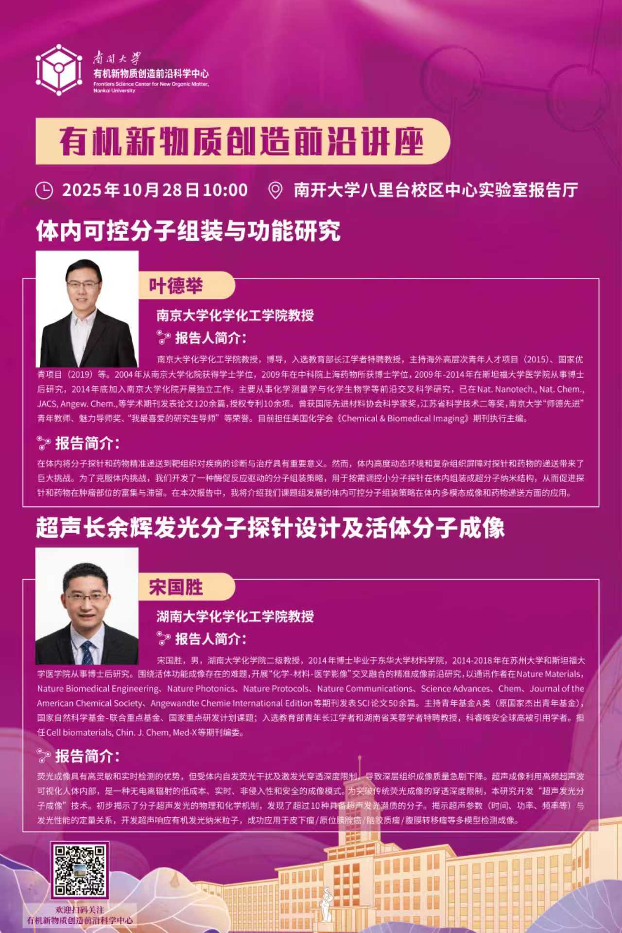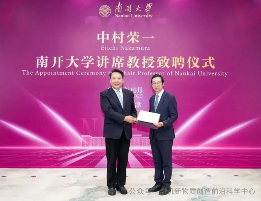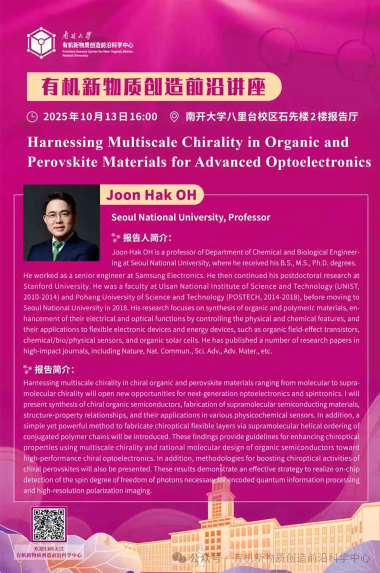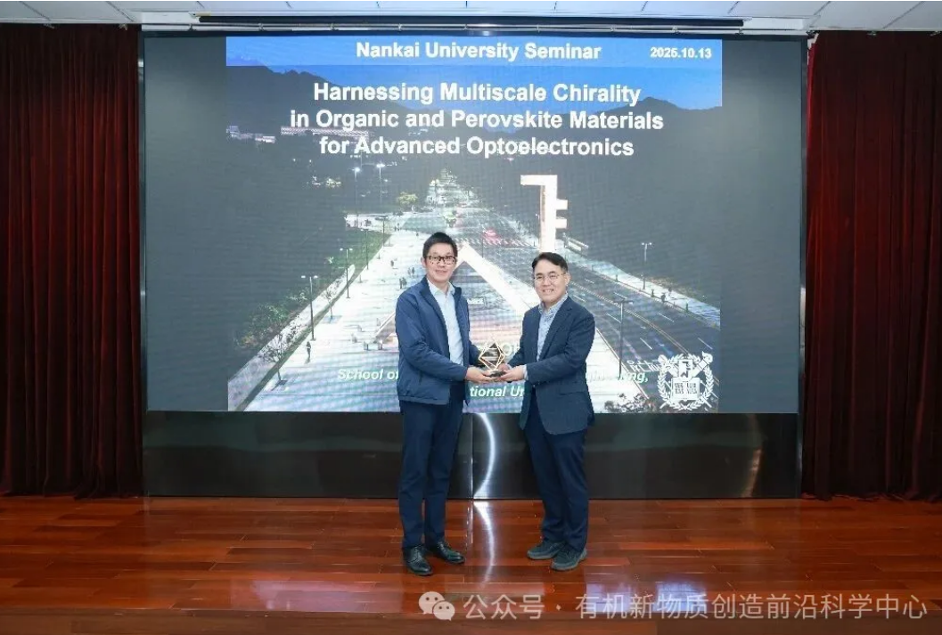 (通讯员:吴婧譞)2025年10月13日,首尔大学Joon Hak OH教授做客“有机新物质创造前沿讲座”,以“Harnessing Multiscale Chirality in Organic and Perovskite Materials for Advanced Optoelectronics”为题做精彩报告,为师生们带来一场手性光电材料领域的学术盛宴。南开大学化学学院副院长袁明鉴教授颁发讲座证书。Joon Hak OH教授首先介绍了团队在手性光电材料领域的系列研究成果,包括手性有机半导体的合成、超分子半导体材料的制备、构效关系及其在圆偏振光探测器中的应用,同时还展示了通过共轭聚合物组装形成超分子螺旋有序结构制备手性光学柔性薄膜的简便高效方法。随后Joon Hak OH教授详细阐述了手性有机材料与手性钙钛矿材料中多尺度手性的研究思路,这种创新思路为下一代光电子学与自旋电子学开辟新机遇。讲座后,Joon Hak OH教授与现场师生积极交流互动,分享科研心得,现场氛围热烈。“有机新物质创造前沿讲座”是南开大学有机新物质创造前沿科学中心的特色学术交流活动。“讲座”将聚焦含碳化合物及