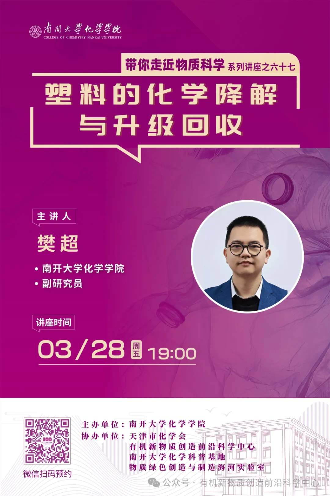南开大学化学学院、天津市化学会、有机新物质创造前沿科学中心、南开大学化学科普基地、物质绿色创造与制造海河实验室,联合推出“带你走近物质科学”系列科普讲座,引领中学生走近化学、材料科学等物质科学类学科,为学生打开一扇大门,探索学科知识、开阔学术视野、激发兴趣志向、涵养科学精神。第六十七场讲座由南开大学化学学院副研究员樊超带来“塑料的化学降解与升级回收”。3月28日(本周五)19点共同期待!樊超,南开大学化学学院副研究员,2015年6月本科毕业于武汉大学,2020年6月获得南开大学博士学位,2021年-2024年在瑞士洛桑联邦理工学院做博士后,2024年至今在南开大学化学学院做副研究员。近五年,以第一作者发表SCI论文4篇。主要研究方向为:金属有机化学、过渡金属催化、不对称催化等。