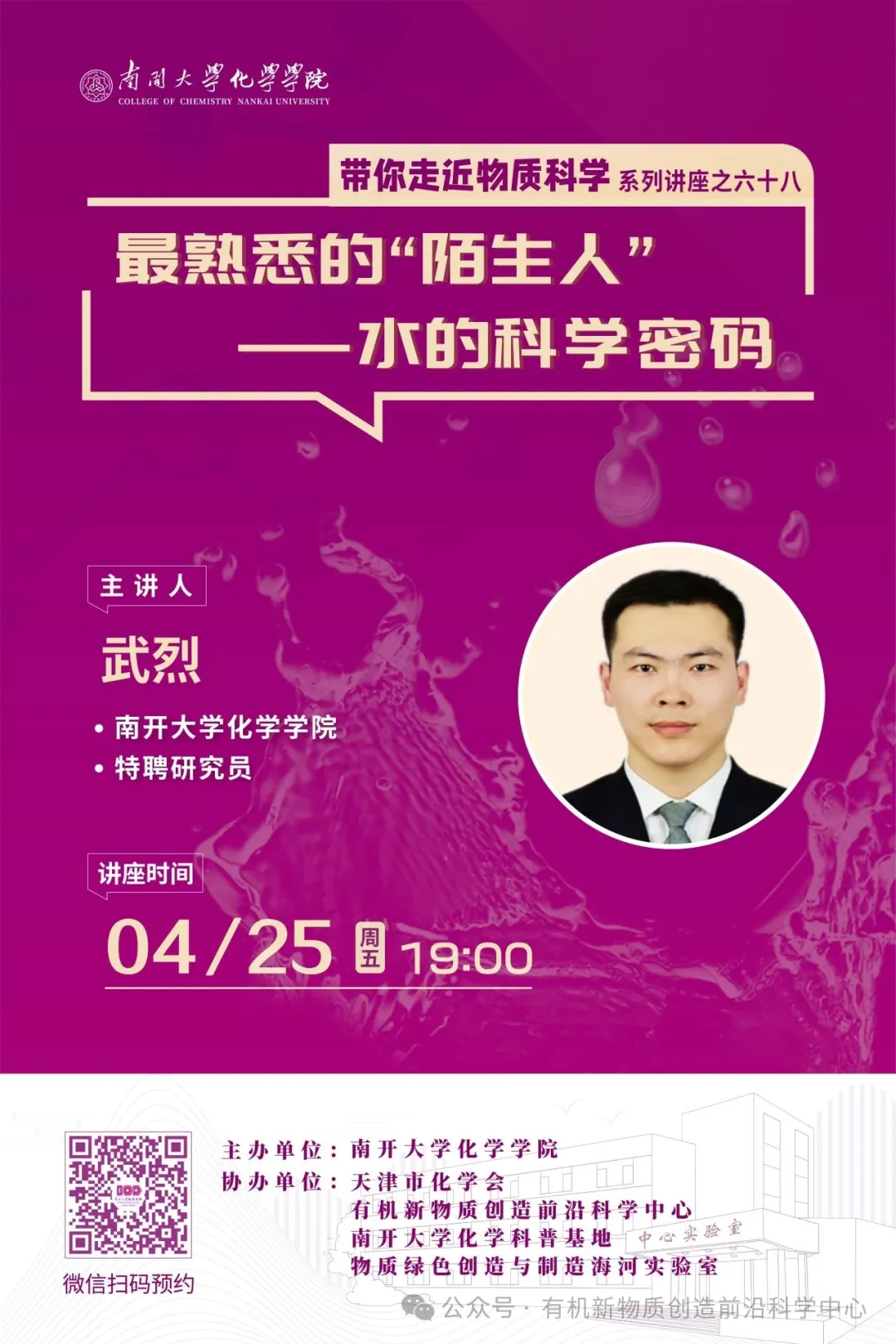 南开大学化学学院、天津市化学会、有机新物质创造前沿科学中心、南开大学化学科普基地、物质绿色创造与制造海河实验室,联合推出“带你走近物质科学”系列科普讲座,引领中学生走近化学、材料科学等物质科学类学科,为学生打开一扇大门,探索学科知识、开阔学术视野、激发兴趣志向、涵养科学精神。第六十八场讲座由南开大学化学学院武烈老师带来《最熟悉的“陌生人”——水的科学密码 》。4月25日(本周五)19点共同期待!