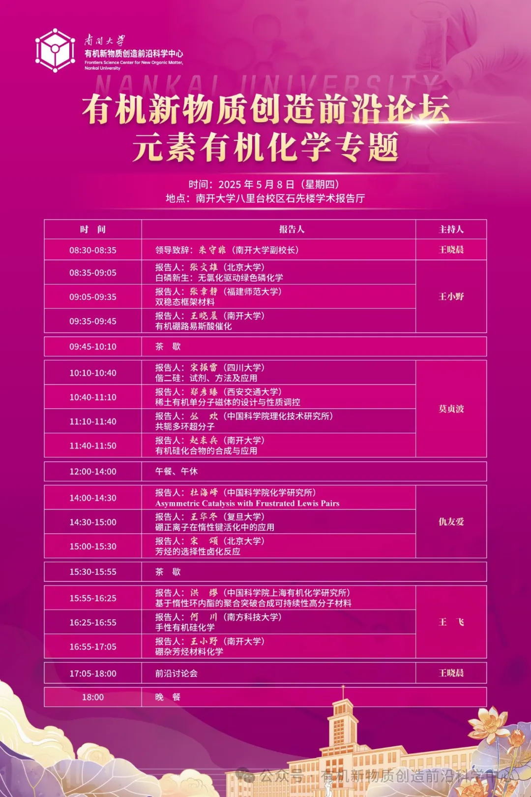南开大学有机新物质创造前沿科学中心将于5月8日在八里台校区石先楼学术报告厅举办有机新物质创造前沿论坛——元素有机化学专题。
