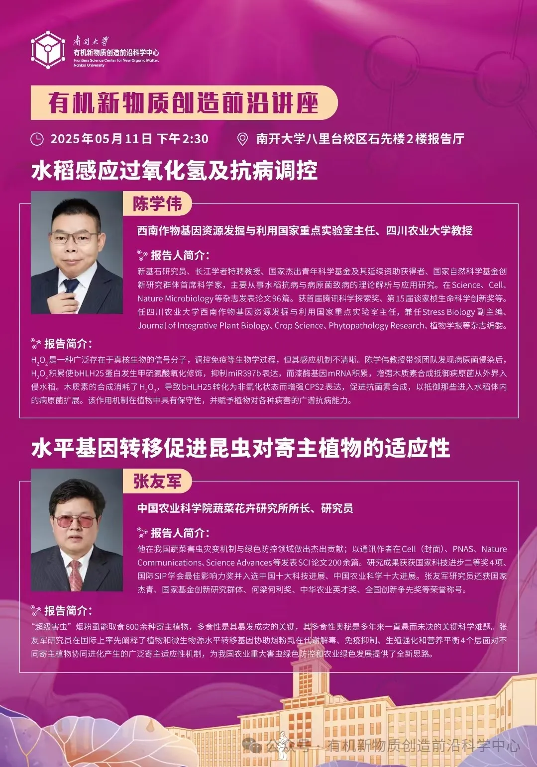 南开大学有机新物质创造前沿科学中心将于5月11日下午2:30,在八里台校区石先楼二楼报告厅举办有机新物质创造前沿讲座。