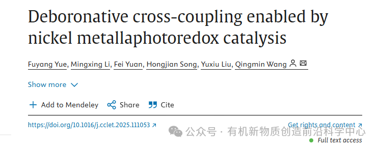 Fuyang Yue , Mingxing Li , Fei Yuan ,Hongjian Song , Yuxiu Liu ,Qingmin Wang , Deboronative cross-coupling enabled by nickel metallaphotoredox catalysis, Chinese Chemical Letters (2025), doi:https://doi.org/10.1016/j.cclet.2025.111053