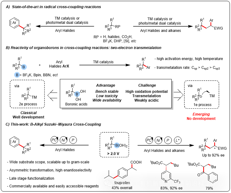 在过去十年间,光氧化还原催化于有机合成领域得到了极为广泛的应用。过渡金属 /光氧化还原双催化体系的蓬勃发展,促使众多新型交叉偶联反应得以实现。金属光催化巧妙借助二者的协同效应,对有机化学的发展产生了极为深远的影响(如图 1A左所示)。光催化剂具备产生自由基以及调控金属催化剂氧化态的能力,这一特性极大地拓展了交叉偶联反应中可选用试剂的范围。在该领域发展的早期阶段,光催化剂主要应用于含氧化还原剂底物的单电子转移过程,进而生成开壳中间体。随后,生成的自由基与过渡金属催化剂相互作用,成功构建 C (sp)-C (sp)键。以 MacMillan等团队为代表,他们运用氢原子转移策略,将自由基前体的范围成功拓展至简单烷烃。与此同时,金属光氧化还原催化剂在卤代物的卤原子转移反应中也展现出了重要作用。近年来,化学家们将研究重点聚焦于利用金属 /光氧化还原双催化体系实现烯烃的双官能团化,并成功开发出多种烯烃分子间碳芳基化方法(如图 1A右所示)。尽管该领域已取得了丰硕的研究成果,但对于新型自由基前体及其高效活化方法的探索需求,依然是驱动该领域研究不断深入的核心动力。过渡金属催化的交叉偶联反应在药物和农用化学品的合成进程中发挥了关键推动作用。然而,在相关合成过程中,引入 C (sp)杂化片段始终是一个亟待攻克的难题。基于硼中心的 Suzuki–Miyaura(SMC)交叉偶联反应为构建 C (sp)-C (sp)键提供了一条行之有效的途径,该反应具有显著优势,比如对各类官能团展现出良好的耐受性,且硼副产物的毒性较低(具体情况如图 1B所示)。尽管如此,当将 Suzuki–Miyaura(SMC)交叉偶联反应应用于构建 C (sp)键时,依然面临一系列严峻挑战。在反应动力学方面,氧化加成以及过渡金属化的速率较为缓慢;在反应中间体稳定性方面,烷基金属中间体极易发生 β-氢消除反应。不仅如此,该反应往往需要使用对空气和水分极为敏感的有机金属化合物,并且通常需要在高温条件下长时间反应,这些因素严重制约了其在实际生产中的广泛应用。鉴于上述现状,开发一种反应条件温和且具有高选择性的硼 -烷基 SMC反应,对于推动有机合成领域的进一步发展具有极其重要的意义。