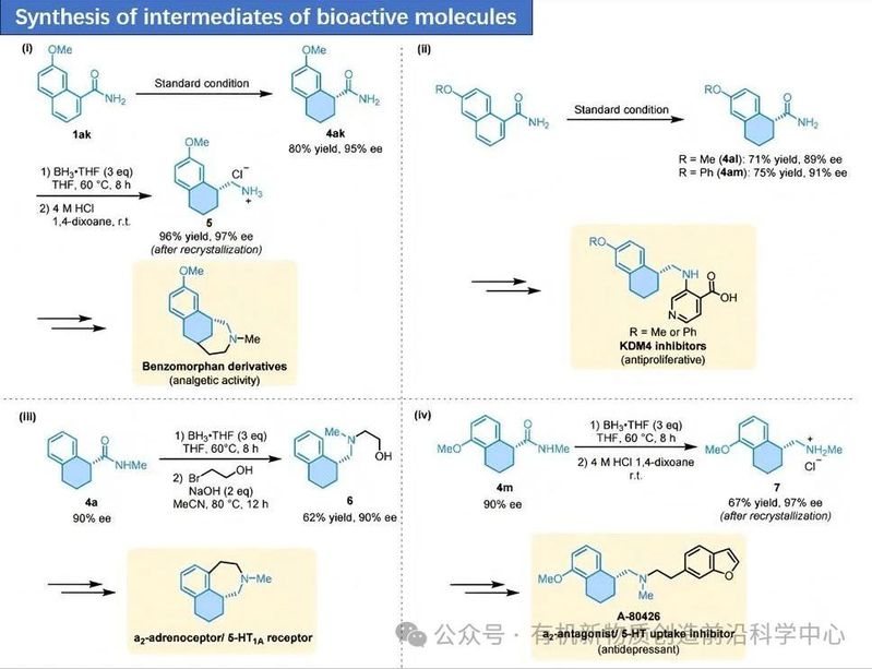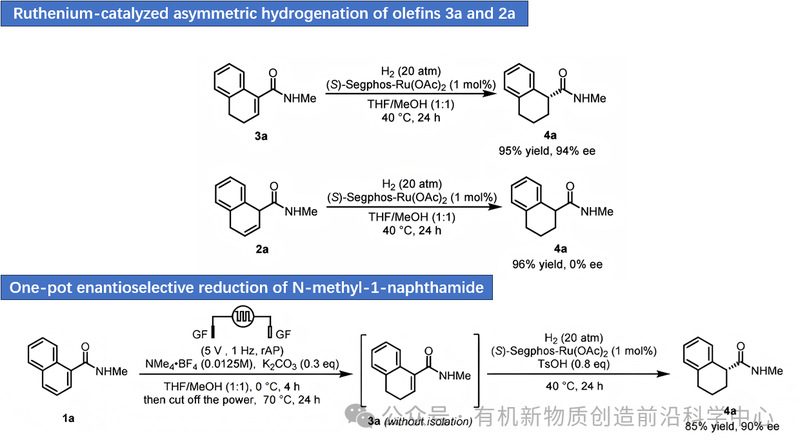 该工作的特点包括:(1)从简单原料直接合成高价值手性化合物:首次将电化学还原与过渡金属催化的不对称氢化相结合,避免了传统方法中复杂的多步合成(经过氰化、水解、不对称氢化和N-烷基化等多个步骤)和使用有毒试剂(如TMSCN), 解决了传统方法中难以直接从简单原料高效合成手性1-四氢萘酰胺的问题。(2)一锅法操作的实现:电化学还原步骤与双键的异构化步骤都需要碱的参与才能实现。然而,后续的不对称氢化步骤中,碱的存在会导致催化剂(如(S)-Segphos-Ru(OAc)2)失活,从而阻碍反应的进行。通过引入了TsOH来中和反应中的碱,从而保护催化剂的活性。该策略在一个反应釜中连续进行,无需分离中间体,实现了将电化学还原、双键异构化和不对称氢化三个步骤的整合。(3)电化学还原的细节:电化学还原步骤通过快速交替极性(rAP)电解实现,在低温(0 ℃)下能够高效地将芳香环部分还原为烯烃中间体,同时避免了析氢反应(HER)的干扰。该过程需要碱(K2CO3)来促进反应。