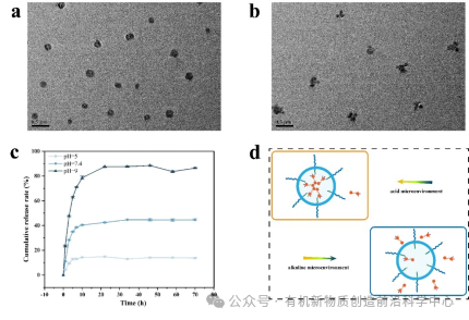 与游离形式的药物或传统药物制剂相比,纳米粒子具有独特的物理化学性质,对生物活性具有协同作用。PIF胶束的平均尺寸为114.7nm(PIF 1g/L、pH=5)。如图4c所示,通过透射电子显微镜(TEM)成像,我们观察到了负载了fenhexamid的纳米胶束的形态。胶束呈规则的球形,平均粒径约为110nm,与DLS结果一致。