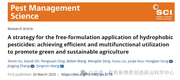 Xu, X., Shi, X., Ding, P., Wang, B., Zeng, M., Liu, Y., Kou, J., Song, H., Zhang, J. and Wang, Q. (2025), A strategy for the free-formulation application of hydrophobic pesticides: achieving efficient and multifunctional utilization to promote green and sustainable agriculture. Pest Manag Sci. https://doi.org/10.1002/ps.8776