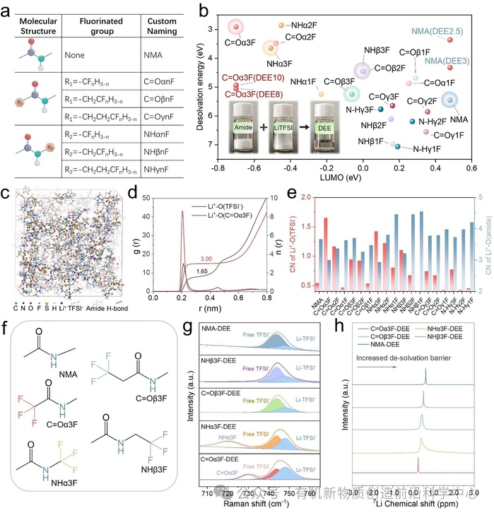 图2. (a) 酰胺分子的自定义命名法。(b) 酰胺分子的LUMO能级及其在低共熔电解质(DEE)中与Li⁺的去溶剂化能量,插图为DEE的制备过程。图中未标注的数据点均对应DEE4。(c) C=Oα3F-DEE的快照及溶剂化结构,球棍模型显示了包含阴离子的溶剂化结构。(d) C=Oα3F-DEE的径向分布函数(RDF)。(e) 分子动力学模拟得到的Li+–O(酰胺)和Li⁺–O(TFSI⁻)配位数(CNs)。(f) 主要实验对象的化学结构。(g) DEEs的拟合拉曼光谱。(h) DEEs的核磁共振光谱(NMR)。