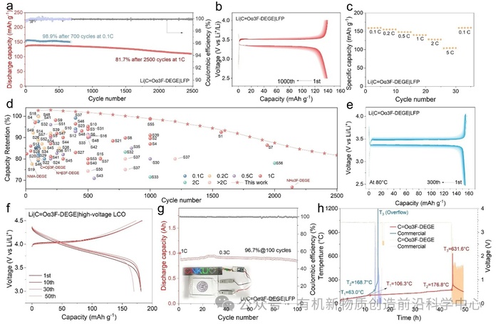 图5. (a) Li|C=Oα3F-DEGE|LFP电池在0.1C和1C下的长期循环性能。(b) 1C下Li|C=Oα3F-DEGE|LFP电池的电压曲线。(c) Li|C=Oα3F-DEGE|LFP电池的倍率性能。(d)本工作与文献报道的Li|凝胶电解质|LFP电池循环性能对比。(e) 80°C下Li|C=Oα3F-DEGE|LFP电池的电压曲线。(f) 1C下Li|C=Oα3F-DEGE|LCO电池的电压曲线。(g) 1.0 Ah Li|C=Oα3F-DEGE|LFP软包电池在0.3C下的循环性能,插图为软包电池实物照片及工作状态的LED。(h) 基于C=Oα3F-DEGE和商用液态电解质的软包电池在ARC测试中的电压和温度曲线。