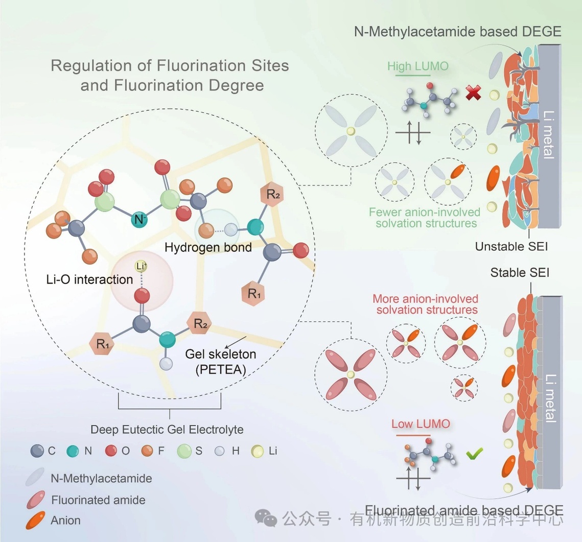 研究团队设计并合成了系列基于氟化酰胺的低共熔凝胶电解质(DEGEs),以N-甲基乙酰胺的氟化衍生物作为HBAs、LiTFSI作为HBDs,引入PETEA作为聚合物骨架。机理研究表明,–CF3基团与羰基的直接相互作用显著降低了分子的LUMO能级(以2,2,2-三氟-N-甲基乙酰胺为代表),能够快速诱导致密SEI的形成;同时较低的Li⁺结合能加速了去溶剂化过程,大幅提升了界面动力学。该研究不仅展示了氟化分子设计在低共熔凝胶电解质中的应用潜力,也为稳定锂金属负极界面提供了新的理论框架和实践路径。