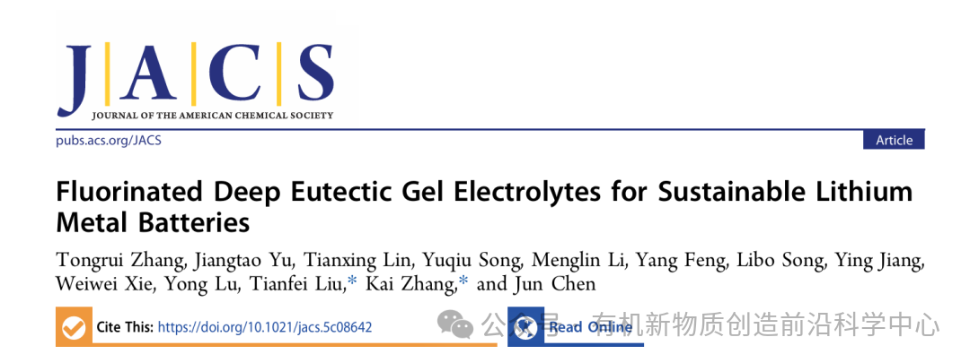 近日,南开大学化学学院、有机新物质创造前沿科学中心陈军院士,化学学院张凯研究员与刘天飞研究员,在《Journal of the American Chemical Society》期刊上发表了题为“Fluorinated Deep Eutectic Gel Electrolytes for Sustainable Lithium Metal Batteries”的研究论文,南开大学有机新物质创造前沿科学中心为论文通讯单位。
