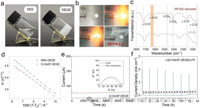 图3. (a) DEE(左)和 DEGE(右)的光学图像。(b) C=Oα3F-DEGE的燃烧测试。(c) PETEA 单体与C=Oα3F-DEGE的FTIR光谱。 (d) NMA-DEGE与C=Oα3F-DEGE的离子电导随温度的变化。(e) 对称Li|C=Oα3F-DEGE|Li电池在10 mV极化电压下的电流–时间曲线,插图为极化前后的Nyquist阻抗谱。(f) Li|C=Oα3F-DEGE|LFP的泄露电流测试。