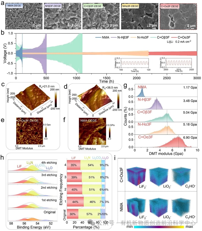 图4. (a) 锂沉积过程的SEM图像。(b) 电流密度为0.2 mAcm⁻2的Li对称电池恒流充放电曲线。(c,d) C=Oα3F-DEGE|Li (c)和NMA|Li (d)的SEI高度图像。(e,f) C=Oα3F-DEGE|Li (e) 和NMA|Li (f) 的SEI杨氏模量映射图。(g) 杨氏模量分布。(h) 来自Li|C=Oα3F-DEGE|Li对称电池的Li金属负极Li 1s刻蚀XPS光谱。(i) C=Oα3F-DEGE|Li和NMA|Li的SEI的ToF-SIMS中LiF2-、LiO2-和C2HO-的三维渲染图。