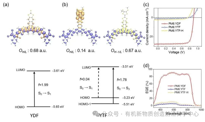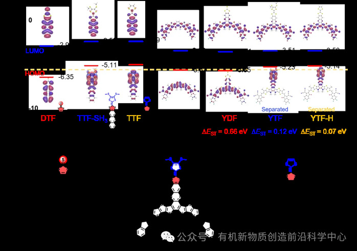 因此,他们通过理论计算筛选了一系列代表性片段,发现把四硫富瓦烯(TTF)单元镶嵌到上述CH系列分子中间单元中,可以产生更高的HOMO能级,而将TTF单元的引入则可以将HOMO定域在TTF单元,而LUMO却基本离域在整个共轭骨架上。这一策略因而可以实现YTF系列分子的HOMO和LUMO的空间分离,有效降低交换积分(J),进而得到小的∆EST。与理论预测的结果一致,他们设计合成的基于TTF单元的YTF和YTF-H受体分子具有超低的∆EST(0.12和0.06 eV)。
