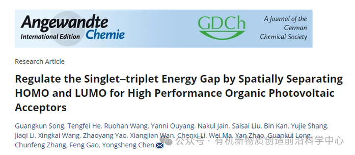 Regulate the Singlet-triplet Energy Gap by Spatially Separating HOMO and LUMO for High Performance Organic Photovoltaic Acceptors,Guangkun Song‡, Tengfei He‡, Ruohan Wang, Yanni Ouyang, Nakul Jain, Saisai Liu, Bin Kan, Yujie Shang, Jiaqi Li, Xingkai Wang, Zhaoyang Yao, Xiangjian Wan, Chenxi Li, Wei Ma, Yan Zhao, Guankui Long*, Chunfeng Zhang*, Feng Gao, Yongsheng Chen*,Angew. Chem. Int. Ed. 2025, 64, e202506357. DOI: 10.1002/anie.202506357