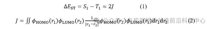 如公式1和2所示,∆EST大约是HOMO和LUMO波函数交换积分(J)的两倍。因此,降低HOMO和LUMO波函数的重叠(∫𝜙HOMO𝜙LUMO𝑑𝑟),或者增加两者之间的空间距离(|r1-r2|),可以降低∆EST。