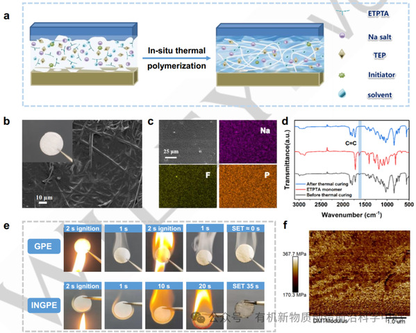 图2. a) GPE制备示意图。b) GPE的扫描电子显微镜图像及光学图像。c) GPE的元素分布图。d) ETPTA单体及热固化前后GPE的傅里叶变换红外光谱。e) GPE与离子凝胶聚合物电解质的单电子晶体管测试结果。f) 由原子力显微镜测试所得的杨氏模量。