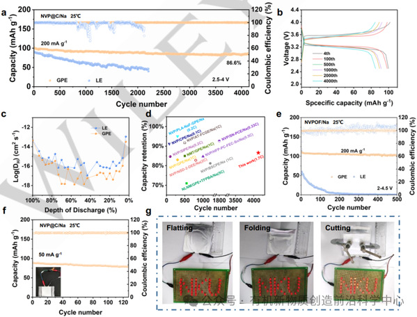 图6. a) 在200 mA g-1电流密度下,Na/NVP@C全电池与GPE(电压范围2.5-4 V,25 ℃)的循环性能;b) 不同循环次数下Na/NVP@C@C全电池的充放电曲线。c) NVP@C/GPE/Na电池在200 mA g-1电流密度下,间歇10分钟后进行3小时开路弛豫的GITT测试扩散系数。d) 与报道的半固态电解质循环性能对比。e) 在200 mA g-1电流密度下,NVPOF/GPE/Na电池(电压范围2-4.5 V,25 ℃)的循环性能。f) NVP@C/GPE/Na软包电池在50 mA g-1电流密度下的循环性能(电压范围2.5-4 V,25 ℃)。g) 软包电池在压平、折叠及切割状态下的破坏性条件测试。