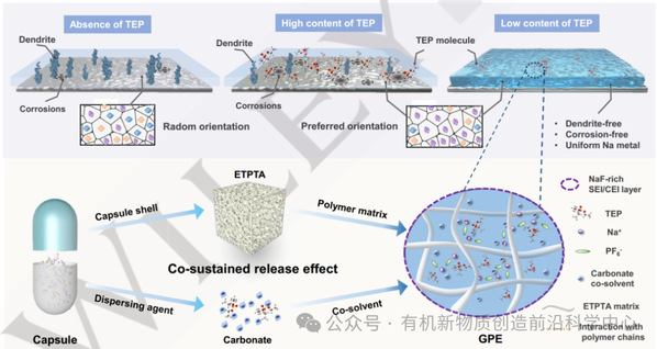 图1. 界面处TEP含量对Na金属阳极的影响示意图(涉及枝晶效应、界面腐蚀及晶面取向),以及具备协同缓释效应的胶囊状凝胶聚合物电解质(GPE)。