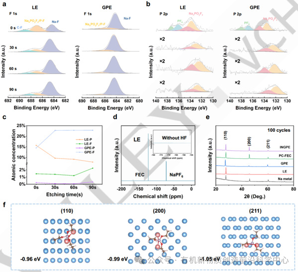 图5. a) 循环后锂金属在LE(左)与GPE(右)条件下的F 1s XPS光谱。b) 循环后锂金属在LE(左)与GPE(右)条件下的P 2p XPS光谱,及c) 相应的F与P原子比率(×2表示信号强度放大两倍)。d) LE的19F NMR光谱,插图为HF的特征峰范围。e) 不同电解质条件下Na金属阳极的非原位XRD图谱。f) TEP与Na(110)/Na(200)/Na(211)晶面间的结合能。
