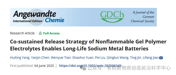Huiting Yang, Yanjin Chen, Wenyue Tian, Shaohui Yuan, Pei Liu, Qinglun Wang, Ting Jin, Lifang Jiao, Co-sustained Release Strategy of Nonflammable Gel Polymer Electrolytes Enables Long-Life Sodium Metal Batteries, Angewandte Chemie International Edition, https://doi.org/10.1002/anie.202506349