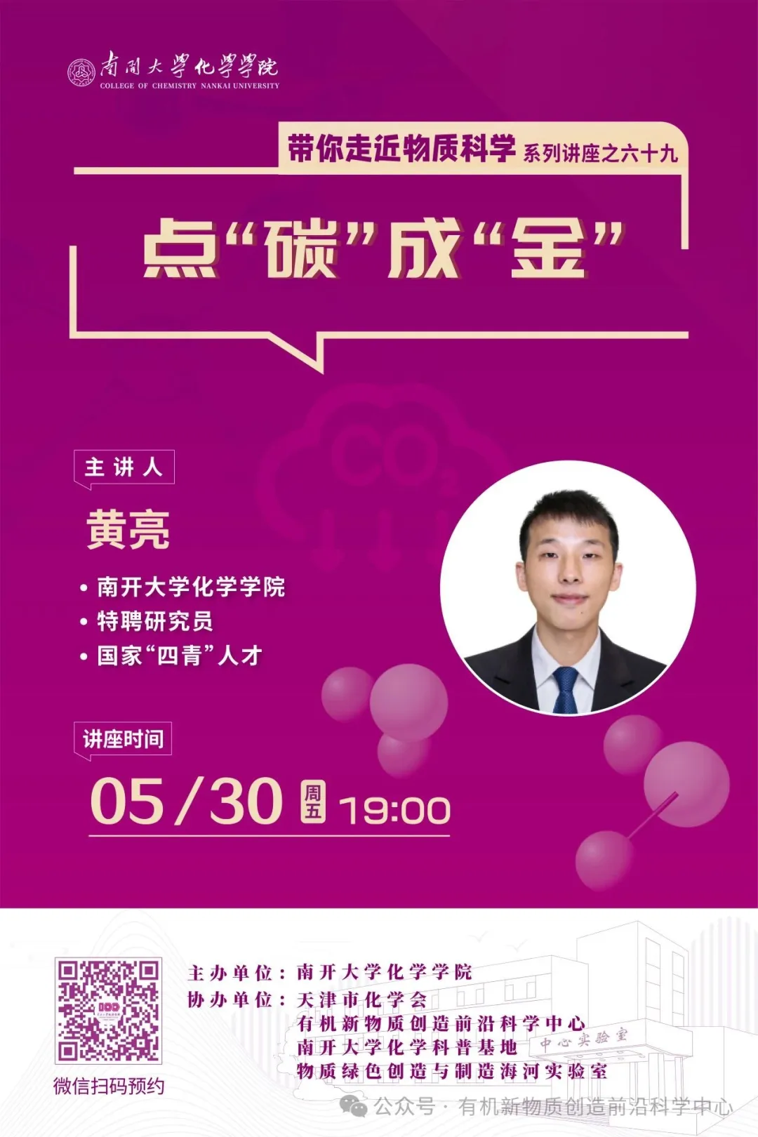南开大学化学学院、天津市化学会、有机新物质创造前沿科学中心、南开大学化学科普基地、物质绿色创造与制造海河实验室,联合推出“带你走近物质科学”系列科普讲座,引领中学生走近化学、材料科学等物质科学类学科,为学生打开一扇大门,探索学科知识、开阔学术视野、激发兴趣志向、涵养科学精神。第六十九场讲座由南开大学化学学院特聘研究员黄亮带来“点‘碳’成‘金’”。5月30日(本周五)19点共同期待!
