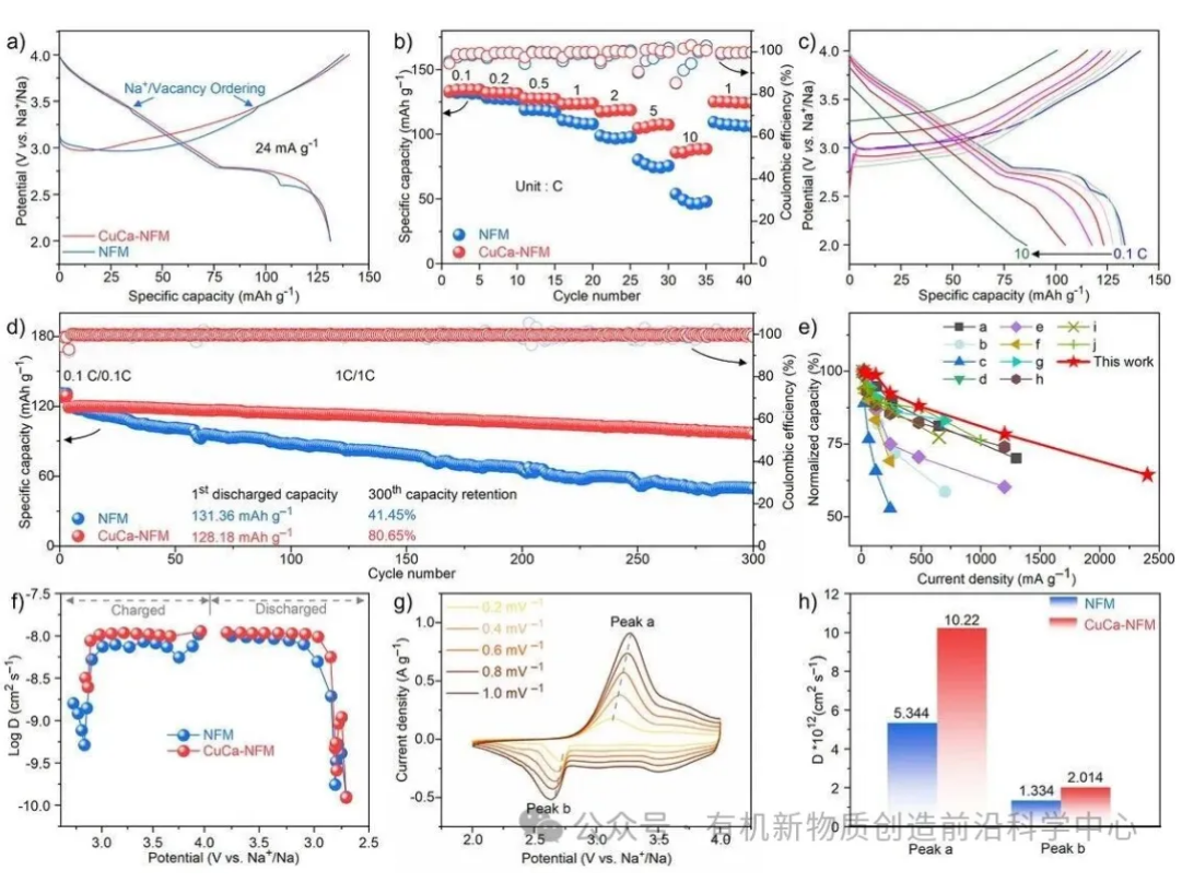 CuCa-NFM在0.1 C倍率下首周放电容量达131.57 mAh g-1,且充放电曲线中平台更为平缓,表明Na+/空位有序现象得到有效抑制。随着电流密度提升至10 C,CuCa-NFM仍能保持86.02 mAh g-1的放电容量,容量保持率达64.38%,显著优于NFM、Cu-NFM和Ca-NFM等对比样品。在1 C倍率下循环300周后,CuCa-NFM的容量保持率为80.65%,体现出优异的循环稳定性。GITT与变扫速CV测试进一步表明,CuCa-NFM在整个充放电过程中极化更小,Na+扩散系数显著高于NFM,说明其具备更快的离子迁移动力学。