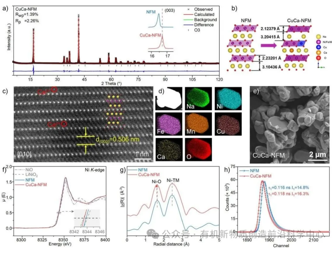 XRD Rietveld精修表明所有样品均呈现典型的O3型α-NaFeO₂结构,属于R-3m空间群,其中Cu2+占据过渡金属层的3b位点,Ca2+则成功嵌入碱金属层的3a位点。与未掺杂NFM相比,CuCa-NFM的(003)衍射峰发生明显位移,说明c轴方向发生晶格收缩,这主要源于Cu–O键的高共价性导致的层间相互作用增强。精修结构参数进一步显示,CuCa-NFM中d(O–Na–O)间距由3.104 Å扩大至3.204 Å,有利于钠离子迁移,而d(O–TM–O)间距的减小则增强了层间键合作用,提升了结构稳定性。HAADF-STEM图像中可见Na位点处存在Ca2+所引起的暗区衬度,结合EDS元素分布图证实所有元素在材料中均匀分布。XANES与FT-EXAFS谱图显示,CuCa-NFM中Ni的K边向低能方向移动约1 eV,表明Ni3+比例降低,有助于缓解Jahn-Teller畸变;同时Ni–O键长缩短,进一步印证了Cu–O键对TM层的稳定作用。正电子湮没谱中CuCa-NFM的τ1寿命值更高,说明Ca2+的引入通过电荷补偿机制增加了材料中的空位浓度。