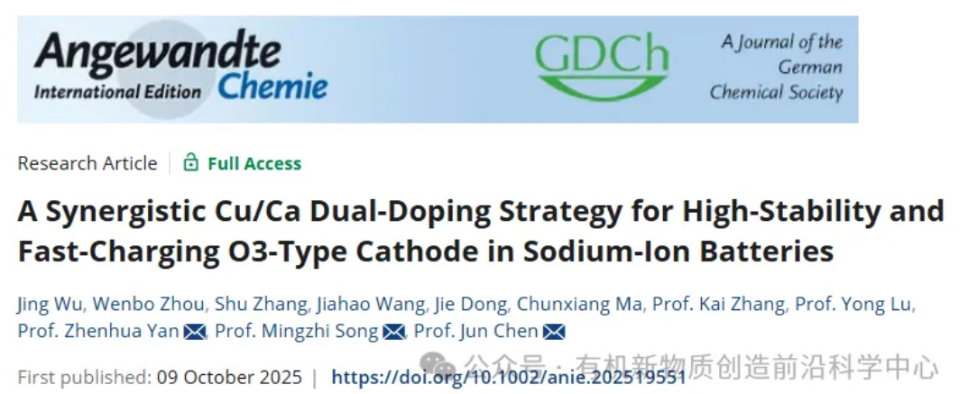 2025年10月9日,南开大学有机新物质创造前沿科学中心陈军院士、严振华副研究员等在《Angewandte Chemie International Edition》期刊发表题为“A Synergistic Cu/Ca Dual-Doping Strategy for High-Stability and Fast-Charging O3-Type Cathode in Sodium-Ion Batteries”的研究论文,南开大学有机新物质创造前沿科学中心为论文通讯单位。
