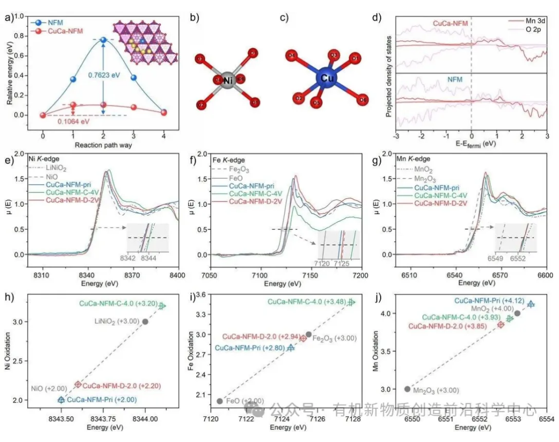 NEB计算表明,CuCa-NFM中Na+迁移能垒较NFM降低约0.66 eV,显著提升了离子迁移速率。Bader电荷分析显示,CuO6八面体中O原子的平均电荷负性更低,说明Cu2+的高电负性使电荷在TM-O键中更为集中,增强了键合强度。pDOS结果表明,CuCa-NFM的O 2p与Mn 3d轨道杂化峰向费米能级移动,且Cu 3d轨道在费米能级附近态密度增强,使材料由半导体特性转变为金属性导电行为,进一步促进了电子传输。XANES谱图证实,在充放电过程中Ni2+/Ni3+与Fe3+/Fe4+氧化还原对参与可逆电化学反应,而Mn4+在整个电压范围内保持电化学惰性,Ca2+则作为电化学惰性支柱维持结构稳定。