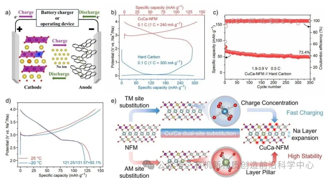 以硬碳为负极组装的全电池在0.5 C倍率下循环350周后容量保持率达73.4%,显示出良好的实用前景。在-20°C低温条件下,CuCa-NFM仍能保持121.25 mAh g-1的放电容量,相当于室温容量的92.1%,且在100次循环后容量保持率为81.74%,表明其具备优异的低温适应性与循环稳定性。综上所述,Cu2+与Ca2+的双位点掺杂策略通过协同调控钠离子传输通道与层间结构稳定性,有效解决了O3型层状氧化物在快充与长循环性能之间的固有矛盾,为高性能钠离子电池正极材料的设计提供了理论依据与实验支撑。