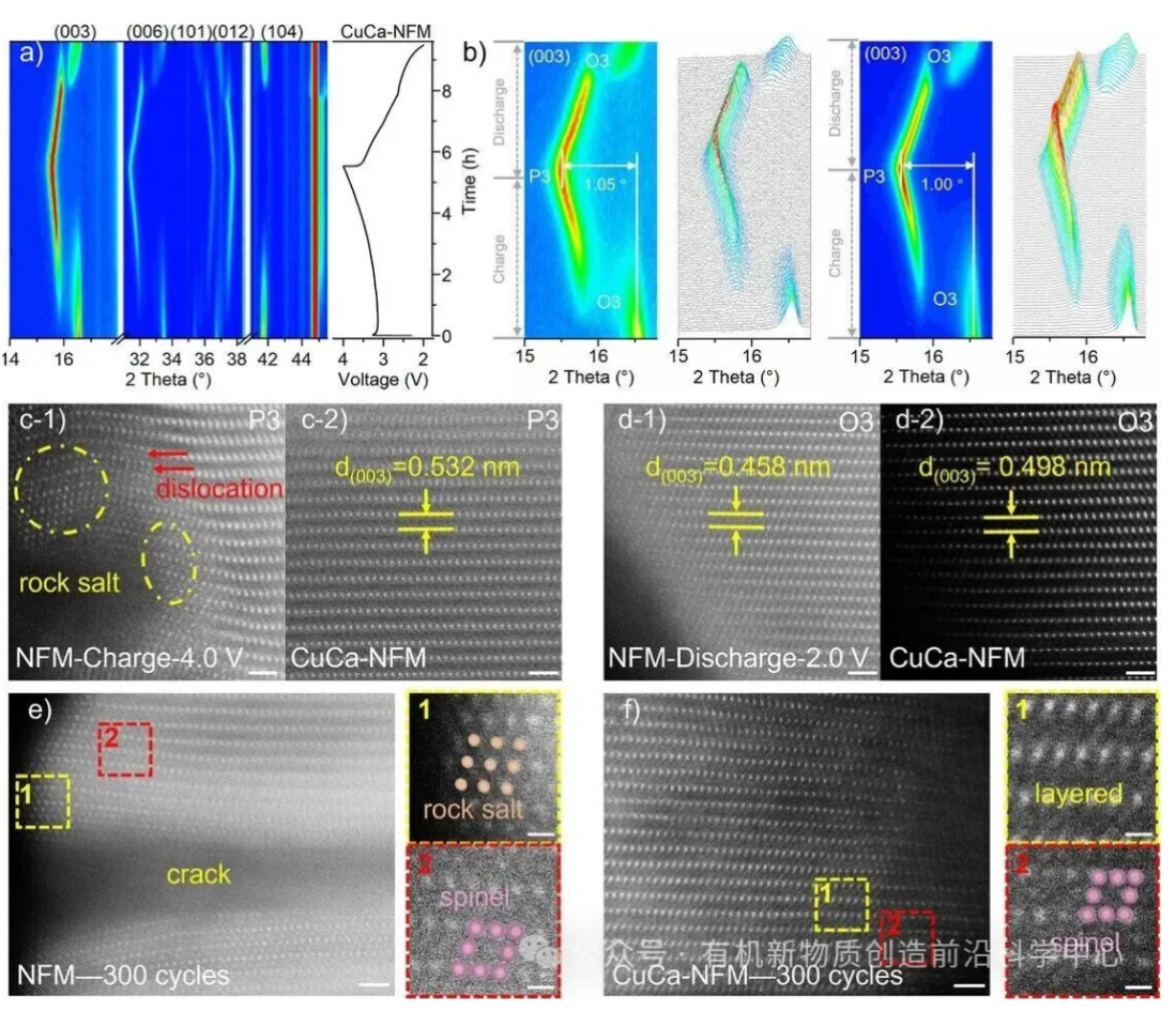 在充放电过程中,CuCa-NFM的(003)衍射峰位移幅度小于NFM,表明其晶格参数变化更为温和,体积应变显著降低。HAADF-STEM图像显示,NFM在充电至4.0 V后表面出现岩盐相与位错,而CuCa-NFM仍保持完整的层状结构;在放电至2.0 V后,NFM出现明显的表面退化,而CuCa-NFM结构仍保持良好。经过300周循环后,NFM颗粒出现裂纹与多种次生相(岩盐相、尖晶石相),而CuCa-NFM仅在其表面检测到少量尖晶石相,整体结构完整性得以保持,说明双位点掺杂有效抑制了循环过程中的结构退化与过渡金属迁移。