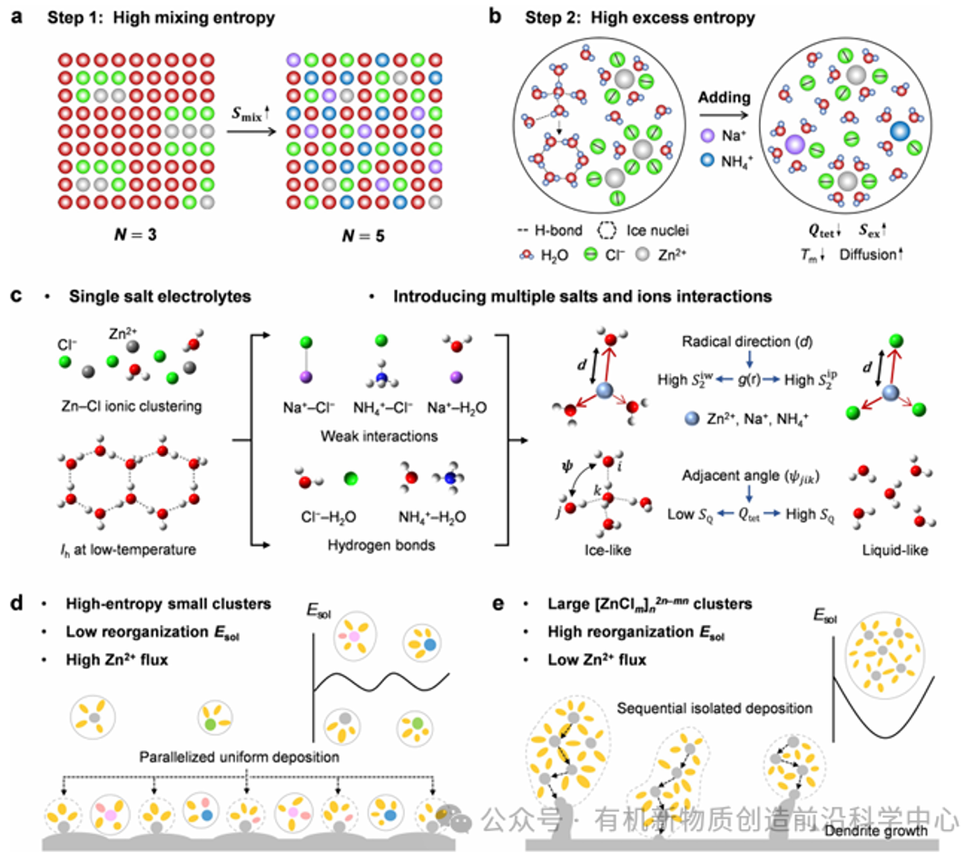 图1 高熵电解液中熵集成示意图。(a)从单盐到三元氯化物盐的高混合熵(Smix)电解液。(b)过量熵(Sex)的影响。四面体水结构在浓单盐电解液的共晶点处转变为冰和水合锌盐。引入Na⁺和NH₄⁺会降低水的四面体参数(Qtet),增加Sex并降低电解液的熔点(Tm)。(c)从单盐到三元盐电解液的配位变化。多种相互作用导致更高的离子-水(iw)和离子-对(ip)两体过量熵(S₂iw,S₂ip)和水四面体熵(SQ)。溶剂化能量(Esol)的波动和沉积机制在(d)三元盐和(e)单盐电解液中的对比。