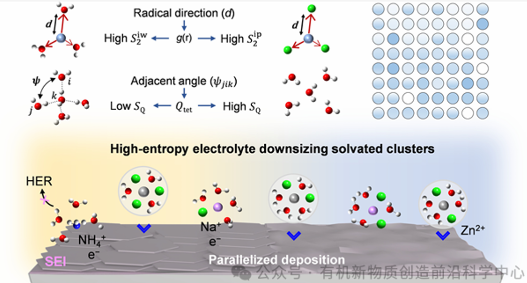 2. 并行离子传输机制:高熵电解液中的熵介导溶剂化结构能够以并行过程去溶剂化并接触锌负极。与传统的大聚集