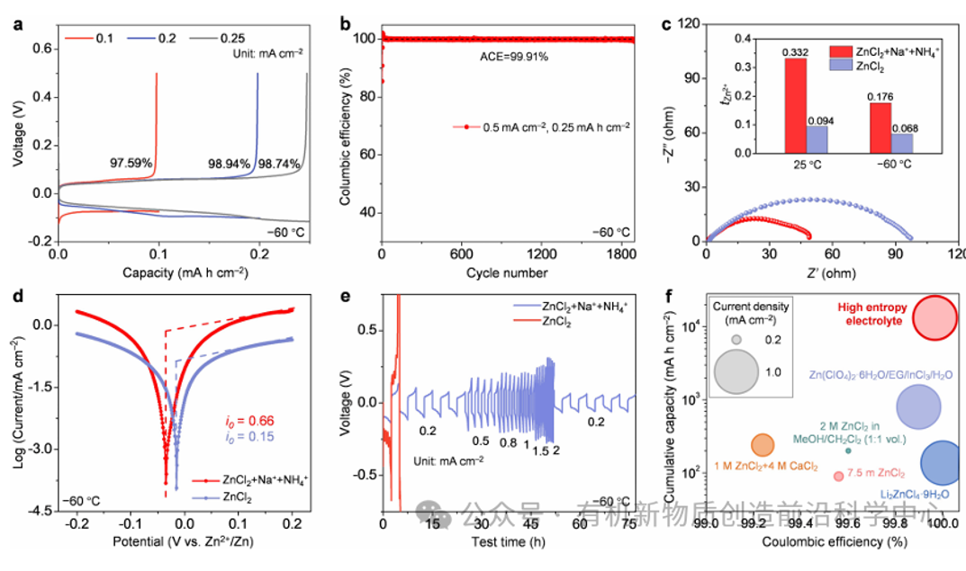 图4 锌负极在高熵电解液中的电化学性能。(a)在-60℃下,ZnCl₂+Na⁺+NH₄⁺电解液的Zn||Cu不对称电池在0.1、0.2和0.25 mA cm⁻²下的初始电压曲线和库仑效率。(b)在-60℃下,Zn||Cu电池在0.5 mA cm⁻²下循环的锌沉积/剥离的库仑效率。(c)Zn||Zn电池的Nyquist图和在25℃及-60℃下计算的Zn²⁺迁移数。(d)在-60℃下,ZnCl₂和ZnCl₂+Na⁺+NH₄⁺电解液的Tafel曲线和锌沉积/剥离的交换电流密度(i₀)。(e)在-60℃下,Zn||Zn电池从0.2到2 mA cm⁻²的倍率性能。(f)在极低温度(低于-50℃)下,使用报道的电解液的Zn对称和不对称电池的库仑效率、累积容量和电流密度的比较。