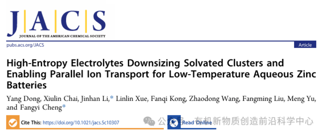 Dong, Y., Chai, X., Li, J., Xue, L., Kong, F., Wang, Z., Liu, F., Yu, M., & Cheng, F. (2025). High-Entropy Electrolytes Downsizing Solvated Clusters and Enabling Parallel Ion Transport for Low-Temperature Aqueous Zinc Batteries. Journal of the American Chemical Society. https://doi.org/10.1021/jacs.5c10307
