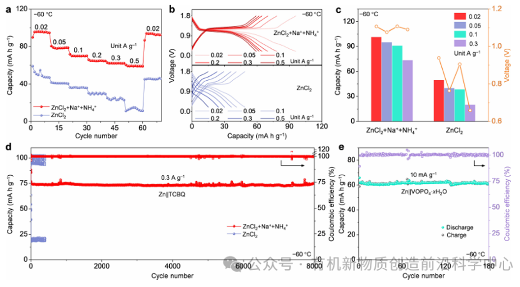 图6 全电池的低温性能。(a)Zn||TCBQ电池在不同电流密度(0.02到0.5 A g⁻¹)下,使用ZnCl₂和ZnCl₂+Na⁺+NH₄⁺电解液的倍率性能和(b)选定的充/放电曲线。(c)在-60℃下,不同电解液中有机TCBQ正极在0.02、0.05、0.1和0.3 A g⁻¹下的平均容量。右y轴是Zn||TCBQ电池在循环过程中的平均电压。(d)在-60℃下,Zn||TCBQ电池在ZnCl₂+Na⁺+NH₄⁺和ZnCl₂电解液中以0.3 A g⁻¹的电流密度进行长期稳定性测试。(e)在-60℃下,使用ZnCl₂+Na⁺+NH₄⁺电解液的Zn||VOPO₄·xH₂O电池在10 mA g⁻¹下的循环性能。