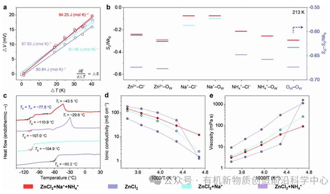 图2 单盐、双盐和三元盐电解液的熵和性能。(a)通过非等温H电池的温度系数拟合结果,估算四种电解液的溶剂化熵,通过创建的温差(ΔT)和两个电极的电位变化(ΔV)。(b)电解液中Zn²⁺、Na⁺、NH₄⁺−Cl⁻/OW的两体对熵(左y轴)和四面体熵(OW−OW,右y轴)。(c)差示扫描量热法(DSC)曲线,确定玻璃化转变温度(Tg)、共晶温度(Te)、结晶(水合物或冰)熔点(Tm)或冰点(Tf)。(d)ZnCl₂、ZnCl₂+Na⁺、ZnCl₂+NH₄⁺和ZnCl₂+Na⁺+NH₄⁺电解液在-60到+20℃温度范围内的离子电导率。(e)上述电解液的粘度。