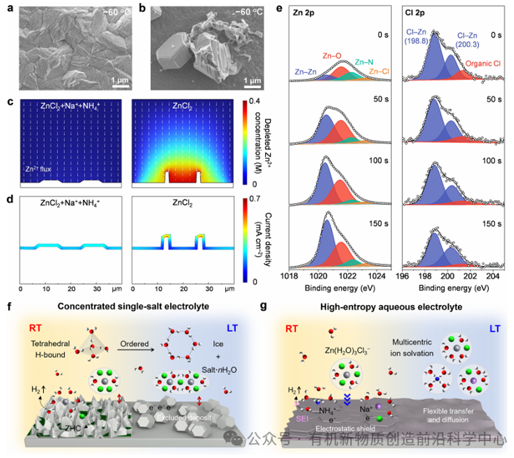 图5 锌沉积形貌和界面化学。(a)在-60℃下,ZnCl₂+Na⁺+NH₄⁺电解液中以0.2 mA cm⁻²的电流密度和1 mA h cm⁻²的面积容量沉积的锌的SEM图像。(b)在相同条件下,ZnCl₂电解液中沉积的锌的SEM图像。(c)在-60℃下,两种电解液在0.2 mA cm⁻²下的Zn²⁺浓度梯度。从沉积形貌推导出单盐和三元盐电解液中的锌枝晶和片状模型。(d)在达到稳态后120秒,锌负极界面处的局部电流密度分布。(e)从ZnCl₂+Na⁺+NH₄⁺电解液中提取的锌负极的Zn 2p和Cl 2p XPS图谱,附深度分析。(f)在室温(RT)下,单盐电解液中HER和枝晶问题的示意图,以及在低温(LT)下电解液的固化导致孤立沉积。(g)高熵水系系统实现灵活的Zn²⁺去溶剂化,均匀的SEI层和平坦的形貌。