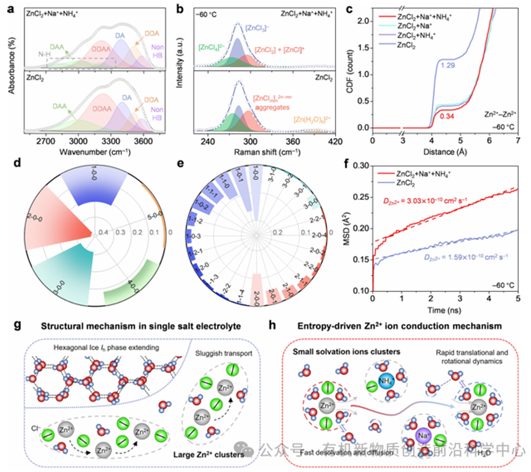 图3 低温下高熵驱动的溶剂化结构。(a)ZnCl₂+Na⁺+NH₄⁺和ZnCl₂电解液的O−H伸缩振动的FTIR图谱和峰拟合。(b)两种电解液在220−420cm⁻¹范围内的拉曼图谱。(c)在不同电解液中,Zn−Zn在4Å距离内的累积分布函数(CDF)。在(d)ZnCl₂和(e)ZnCl₂+Na⁺+NH₄⁺电解液中,通过MD模拟获得的Zn²⁺的溶剂化环境,距离中心Zn²⁺4.8Å范围内。(f)通过模拟均方位移(MSD)随时间曲线得到的Zn²⁺自扩散系数。(g)单盐ZnCl₂电解液中低温Zn²⁺传输行为的示意图,提出六方冰(Ih)扩展机制。(h)三元盐ZnCl₂+Na⁺+NH₄⁺电解液中熵驱动的Zn²⁺传导机制。