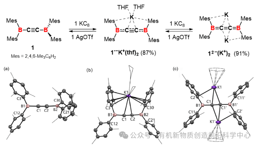 图2. 自由基负离子型1•‒K+(thf)2及双负离子型12‒(K+)2二硼杂三丁烯的合成及其单晶结构