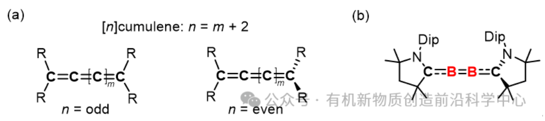 图1. (a) 累积多烯结构;(b) 已报道的缺电子的2,3-二硼杂累积多烯