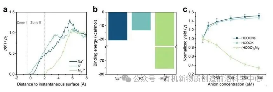 作者还考察了阳离子的影响。结果表明,Na+与K+的界面富集程度相近,对反应的加速效果也类似;而高电荷密度但界面惰性的Mg2+则几乎只在体相分布,导致表面电场被阴离子削弱、反应速率显著下降(图5)。该结果进一步证实了先前的结论。