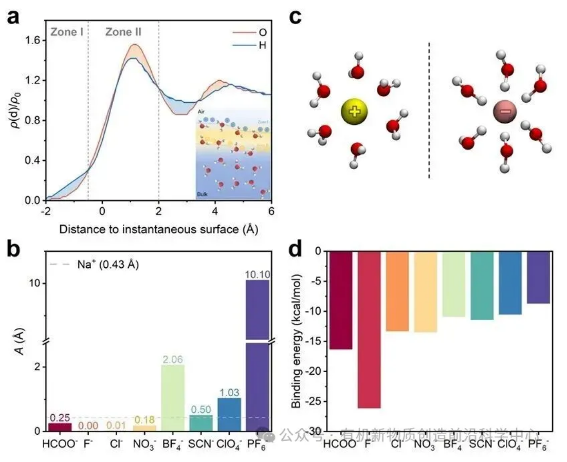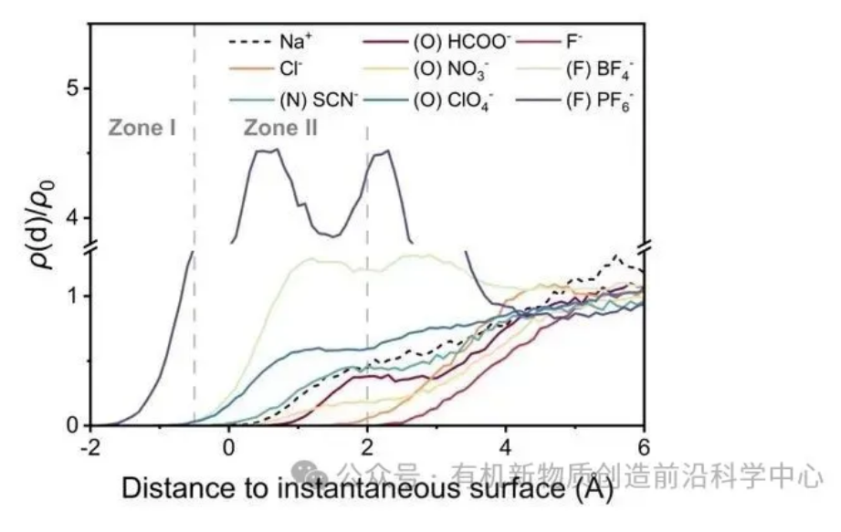 为了探究这一现象背后的微观机制,作者利用MD模拟分析了界面水的结构与离子分布。结果表明,微液滴气-液界面由于水分子有序排列而呈现明显的电荷分离结构:外层界面区(Zone I)氢原子富集,显正电性;内层界面区(Zone II)氧原子富集,显负电性,这种结构是表面电场产生的基础(图3a)。进一步分析不同离子的分布表明,其界面亲和性顺序与Hofmeister序列大体一致,抑制反应的阴离子(BF4-、SCN-、ClO4-、PF6-)更倾向于富集在界面,而HCOO-、F-、Cl-、NO3-的界面亲和性则弱得多(图3b和图4)。作者认为,离子水合结构的差异直接影响其调控电场的能力:阳离子通过吸引水分子中的氧原子,促使氢原子朝外排列,从而增强表面电场;阴离子则吸引氢原子,降低外层氢原子密度,从而削弱电场(图3c)。因此,表面电场的增强或削弱是阴阳离子共同作用的结果。