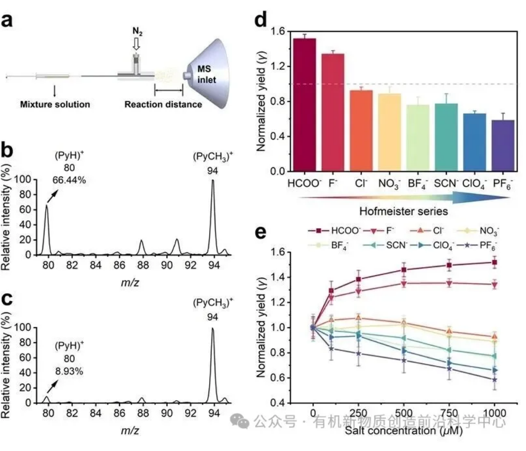 Menshutkin反应是一类典型的SN2反应,在体相中反应速率较慢;而在微液滴中,由于表面电场的作用,其反应速率可提高数个数量级,这在张新星教授团队之前的工作中已被证实(J. Am. Chem. Soc. 2023, 145, 26003)。在此基础上,作者首先验证了电场对该反应的催化作用(图1),并证明Py和CH3I倾向于在界面富集。随后,作者在含有500 μM Py和CH3I的水溶液中分别添加不同单价阴离子的钠盐(HCOO-、F-、Cl-、NO3-、BF4-、SCN-、ClO4-、PF6-)并雾化为微液滴(图2a)。在相同反应时间下,通过质谱检测产物信号,并以产物 (PyCH3)+的信号强度和产物与反应物 (PyH)+的信号强度和的比值作为反应产率。与无盐体系(产率约60%)相比,加入1000 μM HCOONa可将产率提高至91.8%,说明HCOONa对反应具有明显加速作用(图2b-c)。系统比较各含盐体系的归一化产率发现,反应速率随阴离子种类变化呈现出与Hofmeister序列高度一致的趋势(图2d-e):HCOO->F->Cl->NO3->BF4- ≈ SCN-> ClO4-> PF6-。该趋势在不同盐浓度下保持稳定,表明离子特异性效应对反应速率的影响具有普遍性。