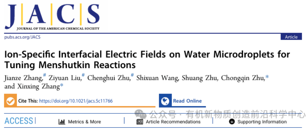 Ion-Specific Interfacial Electric Fields on Water Microdroplets for Tuning Menshutkin Reactions, Jianze Zhang, Ziyuan Liu, Chenghui Zhu, Shixuan Wang, Shuang Zhu, Chongqin Zhu*, Xinxing Zhang*, J. Am. Chem. Soc., 2025, DOI: 10.1021/jacs.5c11766