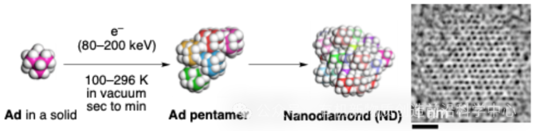 团队利用原子分辨率透射电子显微镜,成功实现了通过电子束照射金刚石骨架结构的金刚石烷晶体,合成纳米级球形金刚石(nano diamond,ND)。传统的金刚石合成通常需要极其严苛的条件,团队以金刚烷分子的自由基阳离子作为重要中间体,在−173℃至室温、10⁻5 Pa的温和环境下,短时间内完成了材料合成。值得关注的是,通过原位观察与反应速率分析证实,研究人员成功合成出粒径高度均一(2–8nm)的金刚石,且产率接近100%。此外,该研究揭示碳–氢键断裂为反应的速率决定步骤,并确认最终形成的金刚石表面以氢原子封端。这种基于电子束照射的精密有机合成手法,为金刚石合成开辟了全新反应路径。