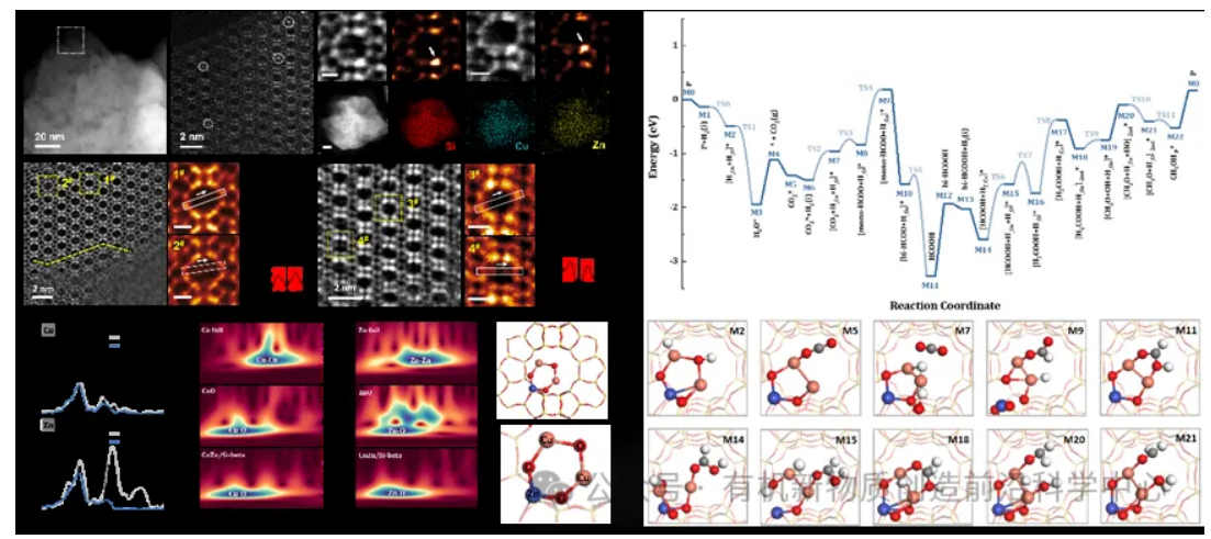 分子筛稳定三核Zn₁Cu₂位点结构(左图)与CO₂加氢制甲醇的反应势能图(0K,右图)