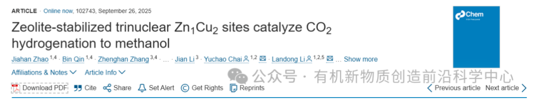 有鉴于此,南开大学化学学院、有机新物质创造前沿科学中心李兰冬/柴玉超团队在脱铝Beta分子筛中利用羟基窝锚定三核Zn₁Cu₂活性位点,揭示了此模型体系上CO₂加氢制甲醇行为和机制。相关论文近日以“Zeolite-stabilized trinuclear Zn₁Cu₂ sites catalyze CO₂ hydrogenation to methanol”为题在线发表于《Chem》期刊,南开大学博士研究生赵嘉涵、秦斌博士和南京大学博士研究生章正汉为共同第一作者,南开大学柴玉超研究员和李兰冬教授为共同通讯作者,南开大学有机新物质创造前沿科学中心为论文通讯单位。