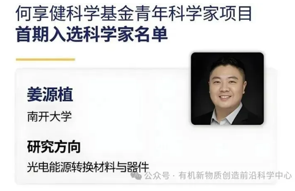 9月29日,“何享健青年科学家”首期项目资助名单正式揭晓,南开大学化学学院、特种化学电源全国重点实验室、有机新物质创造前沿科学中心特聘研究员姜源植凭借其在光电能源转换材料与器件领域的创新成果成功入选。