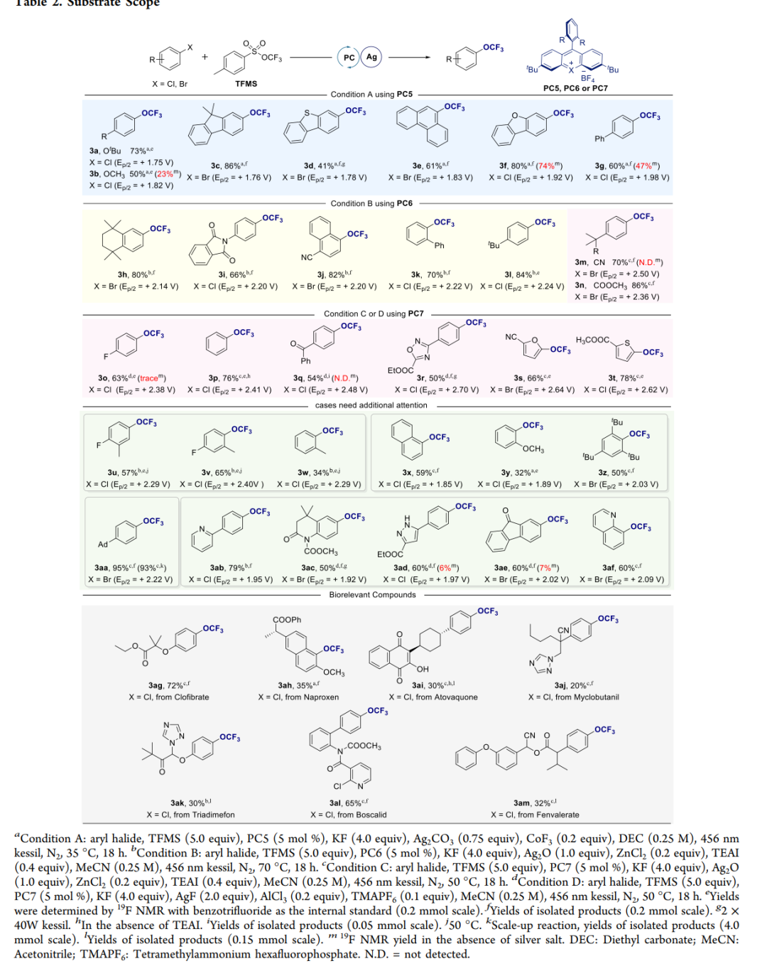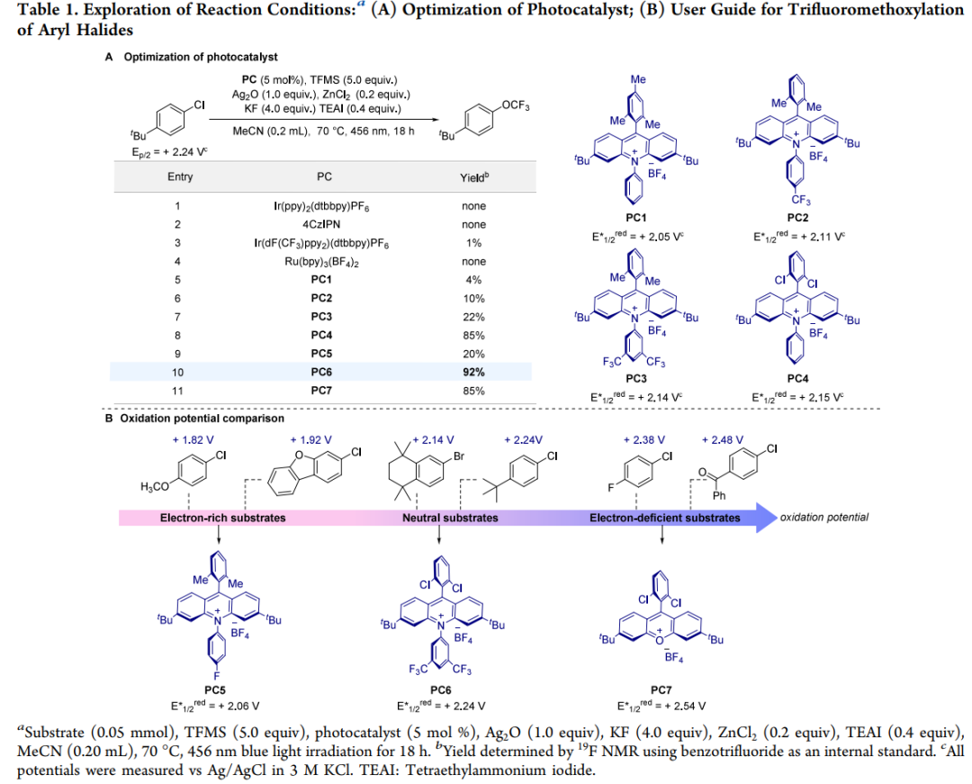 作者以4-叔丁基氯苯1l为模型,TFMS(5 eq)为OCF₃源,系统筛选光敏剂、银盐、碱及添加剂。最优条件为:Acridinium PC6(5 mol%)、Ag₂O(1 eq)、KF(4 eq)、ZnCl₂(0.2 eq)、TEAI(0.4 eq),MeCN 0.25 M,456 nm蓝光、70 °C、18 h,¹⁹F NMR收率92%。TEAI兼具增溶与稳定OCF₃作用;PC6激发态还原电位(+2.24 V)与底物氧化电位匹配最佳;无银时反应完全停止,凸显银对惰性卤化物不可或缺。
